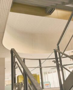 吸音性能が高く残響を抑える効果があるため、人が集まる公共施設の天井材として広く採用されています。